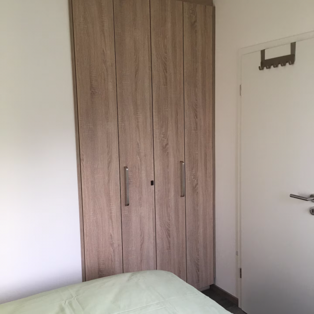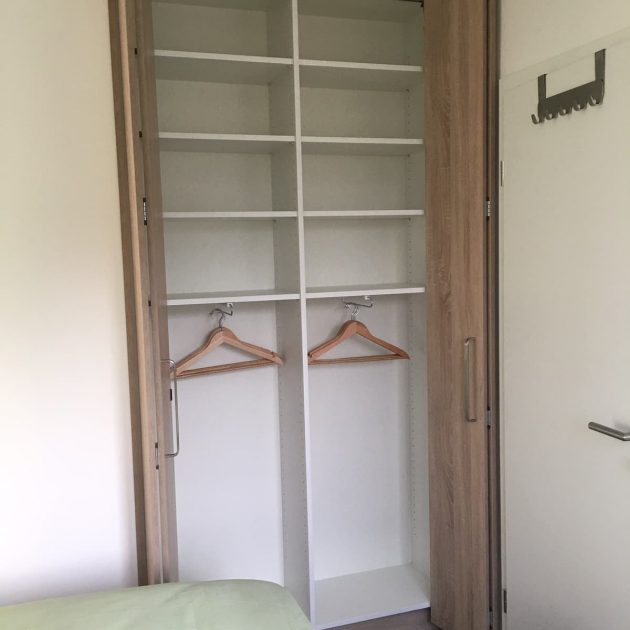 Das Schlafzimmer, das hell und modern eingerichtet ist, verfügt über zwei Betten die wahlweise getrennt oder als Familienbett genutzt werden können und einen geräumigen Einbauschrank, beides vom Schreiner gefertigt.