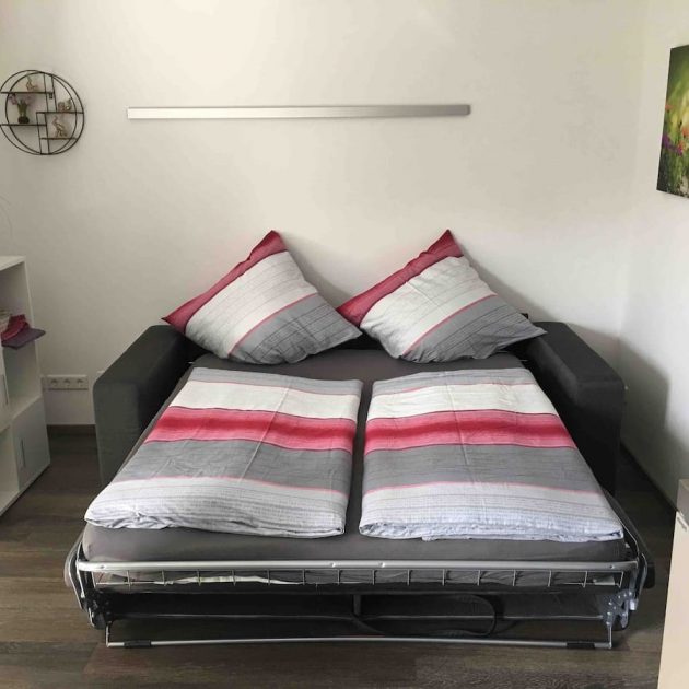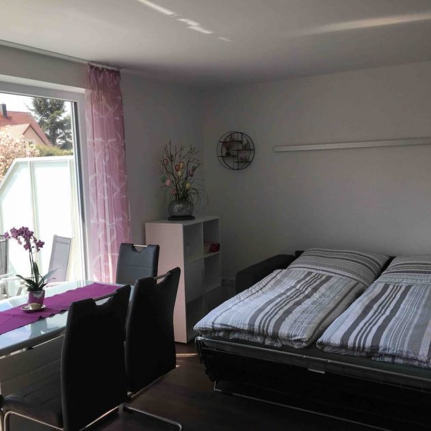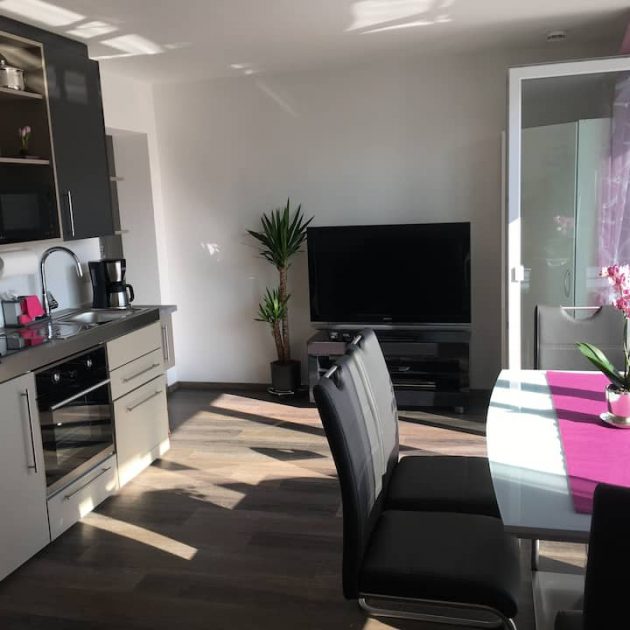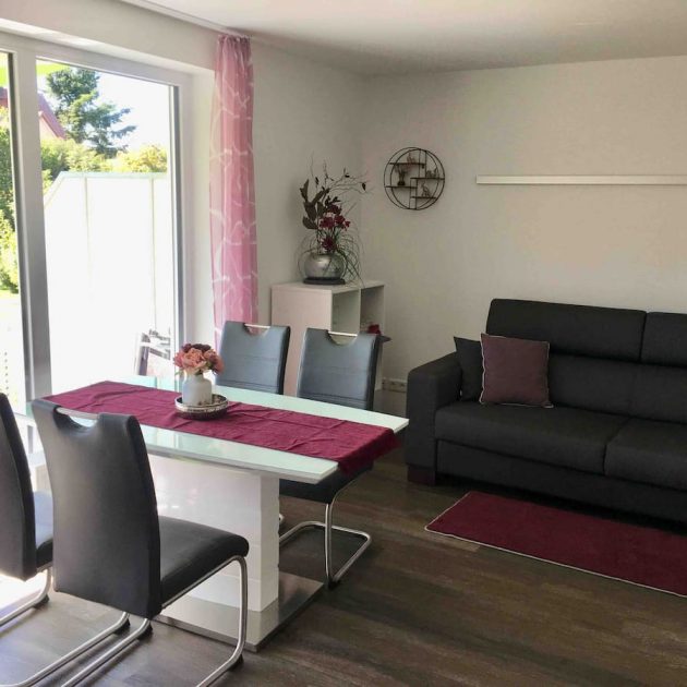 In den großen Sonnendurchflutetem Wohnraum befindet sich eine große Schlafcouch mit Matratze auf der zwei Personen bequem Platz zum Schlafen finden. Die hochwertige Küchenzeile wurde zum größten Teil vom Schreiner gefertigt und besteht aus Kühlschrank, Spülmaschine, Backofen, Ceran-Kochfeld, Mikrowelle, Kaffeemaschine, Wasserkocher und einer guten Auswahl an Geschirr. Der Essplatz an der großen Fensterfront lädt zum gemütlichen Beisammensein ein. Die TV-Anlage entspricht dem neuesten Stand der Technik inkl. Telekom Receiver, Internet-Fernsehen (Magenta Home). Im Wohnbereich befindet sich auch der Zugang zum 8 qm großen Balkon mit Markise, dieser wurde mit 4 Stühlen und einem Tisch bestückt. Der Blick in den schönen großen Garten und die Ruhe laden zum Verweilen ein.